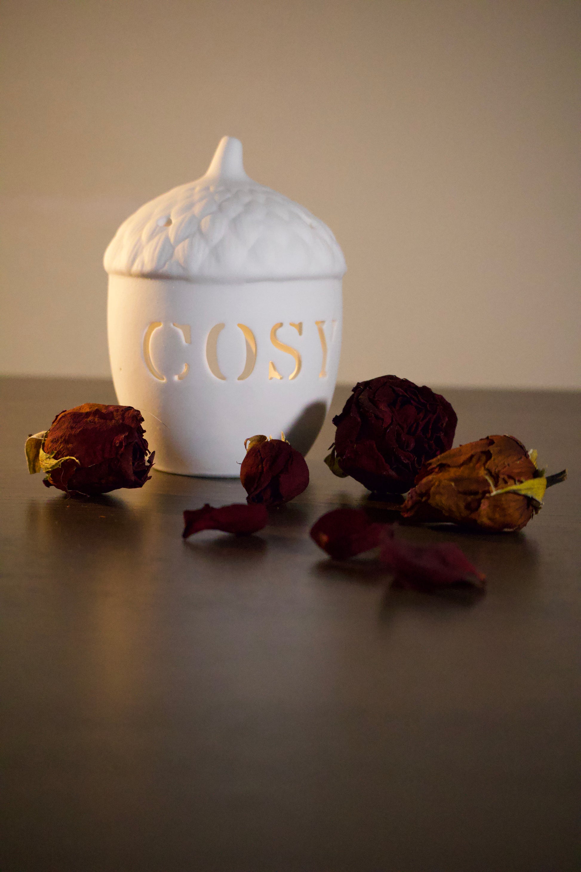 Inspirado en la calidez del otoño y la magia de los pequeños rincones, nuestro porta velas Cosy Home con forma de bellota y acabado cerámico mate en tono blanco suave, esta diseñado para transformar cualquier espacio en un refugio acogedor.