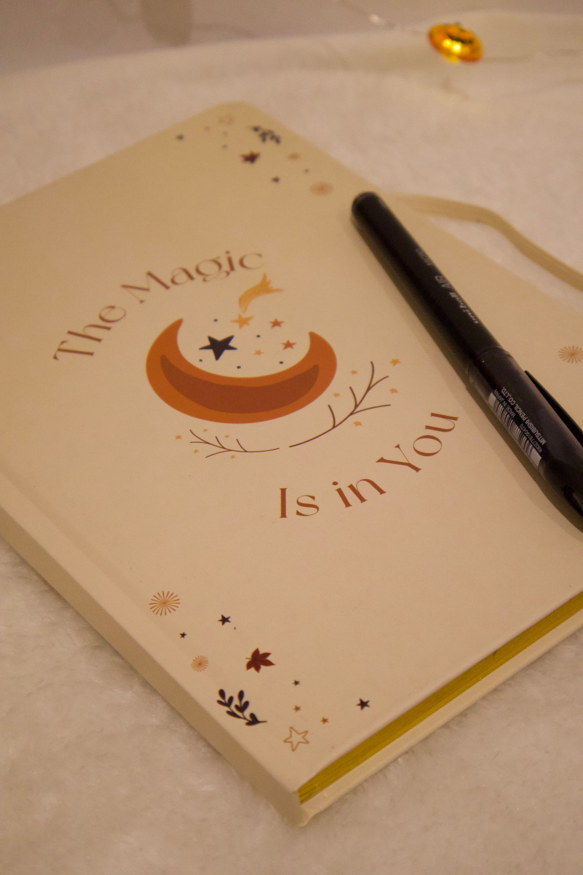 Su tapa crema, decorada con una luna naranja y estrellitas en tonos otoñales, invita a soñar mientras cada página con bordes dorados transforma tus pensamientos en pequeñas joyas de inspiración.💫